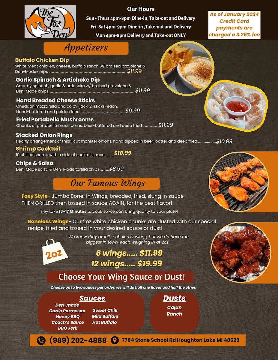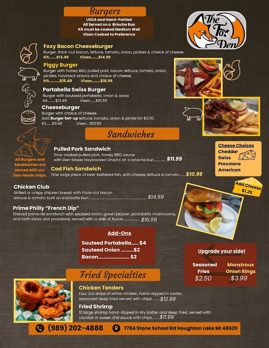 Welcome to The Fox Den Restaurant, a hidden gem nestled in Houghton Lake, MI. This family-friendly eatery shines not only for its warm atmosphere but also for its commitment to exceptional service. Guests rave about the diverse menu, featuring highlights like the massive Foxy bacon cheeseburger, mouthwatering French onion soup, and delectable fried shrimp. Each dish is crafted with care and local ingredients, capturing the essence of community support that owner Mark exemplifies.